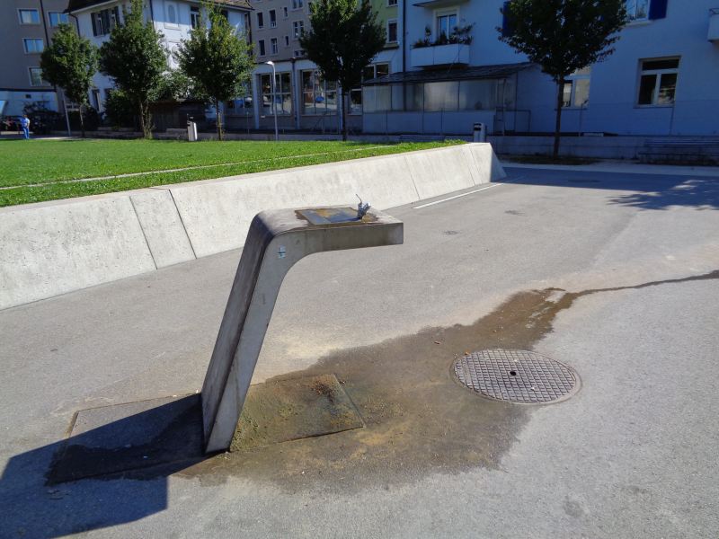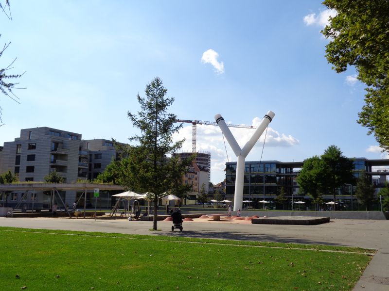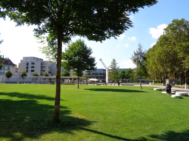 Der Park besteht aus verschiedenen Sequenzen, welche durch zwei breite, baumbestandene Flanierzonen in Längsrichtung verbunden sind. Dazwischen gibt es Spielwiesen für sportliche Betätigung oder für ruhigen Aufenthalt. Die Wiesenflächen sind an jeweils einer Ecke überhöht, Mauerelemente aus hellem Beton überwinden die Höhendifferenz und bilden damit Sitzgelegenheiten.