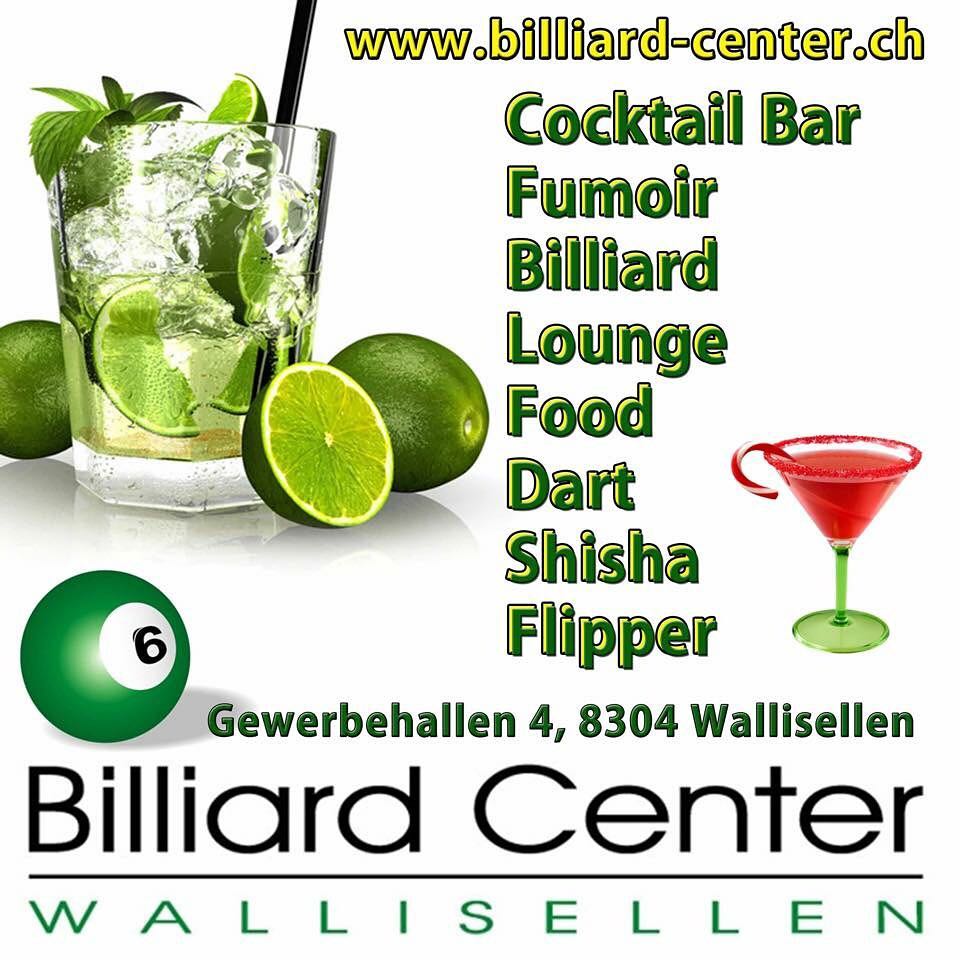 Bei uns können Sie sich für Ihr Billiardspiel Zeit nehmen. Diesen Genuss können Sie an einem unserer neun 9er Tischen erleben. Das Billard Center Wallisellen bietet für jeden etwas! Sei es nun als gemütlicher Treffpunkt auf einen Drink, eine Runde Billiard oder Dart, eine spannende Live-Übertragung auf der TV-Grossleinwand oder aber als Lokation für Ihren nächsten Firmenapéro oder speziellen Event. Mädels aufgepasst! Jeden Mittwoch spielt Ihr einen Stunde kostenlos! Dies gilt jedoch nur, wenn alles Ladies an einem Tisch spielen. Gemischte Tische bezahlen den normalen Preis. Sonntags-Aktion: Jeden Sonntag von 14.00h bis zum Schluss bezahlst du nur Fr. 45.- statt 73.- für 2 Stunden Billiard (inkl. einer Speise und 2 Softgetränke nach Wahl )