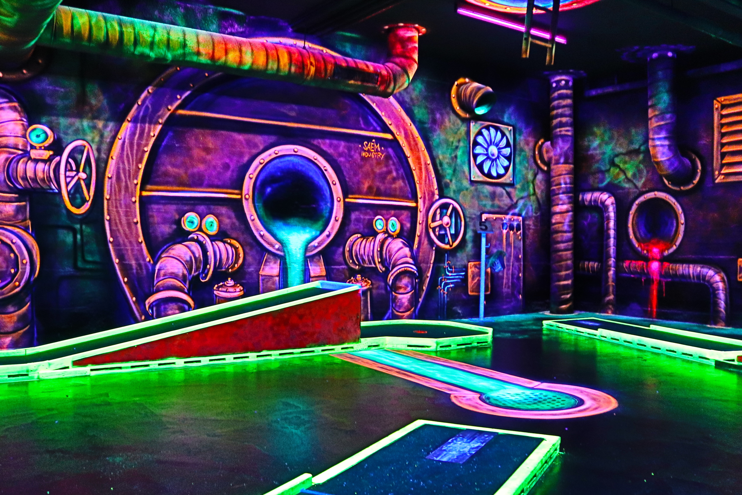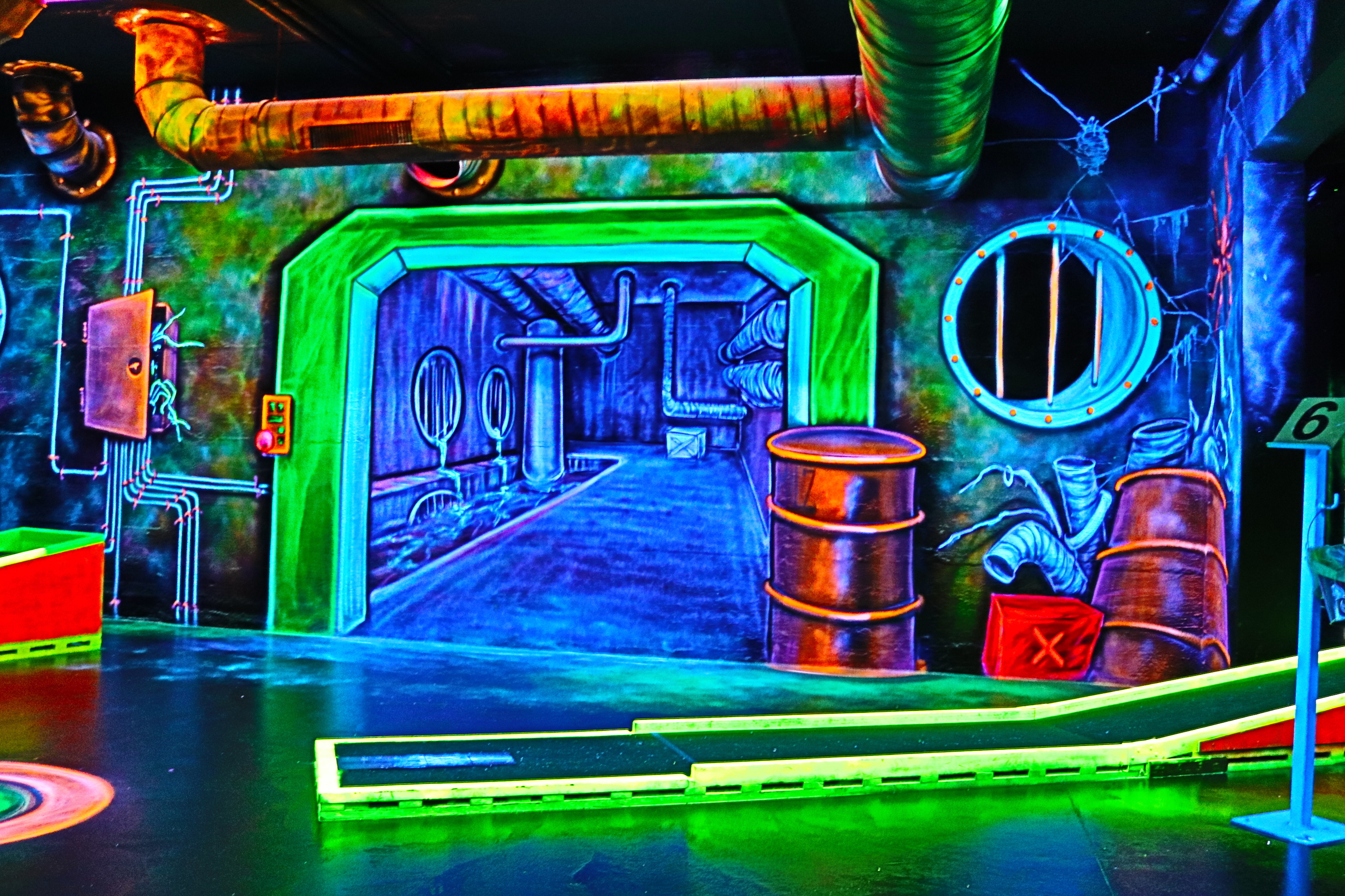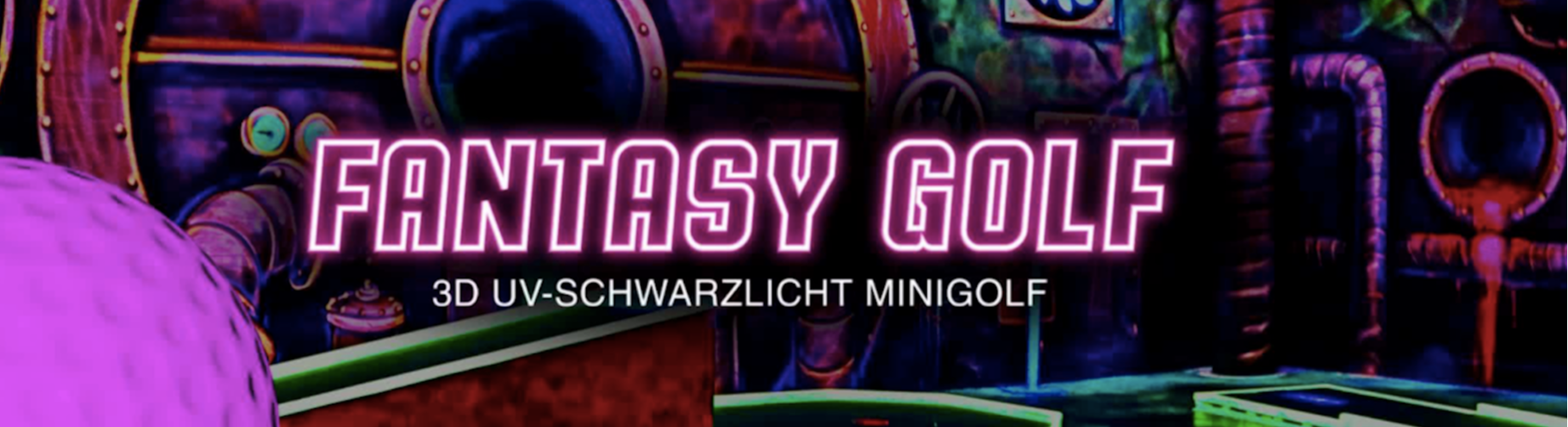 Hier im Fantasy Golf mit 3-D-Schwarzlicht erwartet Euch ein neuer Freizeitspaß in ungewöhnlich-fantastischem Ambiente! Wetterunabhängig taucht Ihr ein in eine berauschende Farbenwelt und unternehmt eine aussergewöhnliche Reise in anderen Sphären. In dieser Umgebung spielt Ihr in einer rund 500 Quadratmeter großen Halle auf 18 Minigolfbahnen. Die Wände sind mit schwarzlicht-aktiven Farben und sagenhaften 3-D Motiven gestaltet worden.