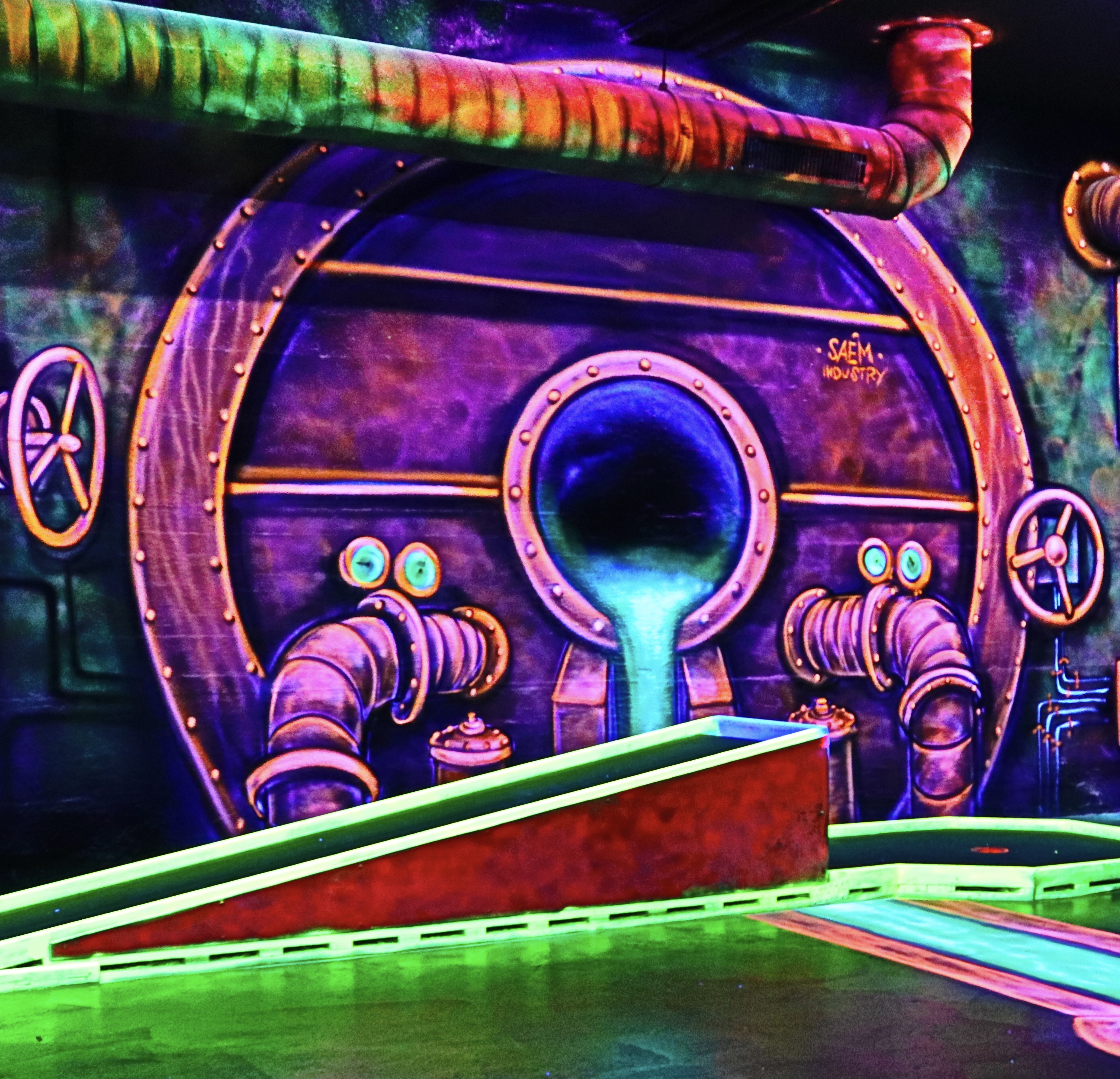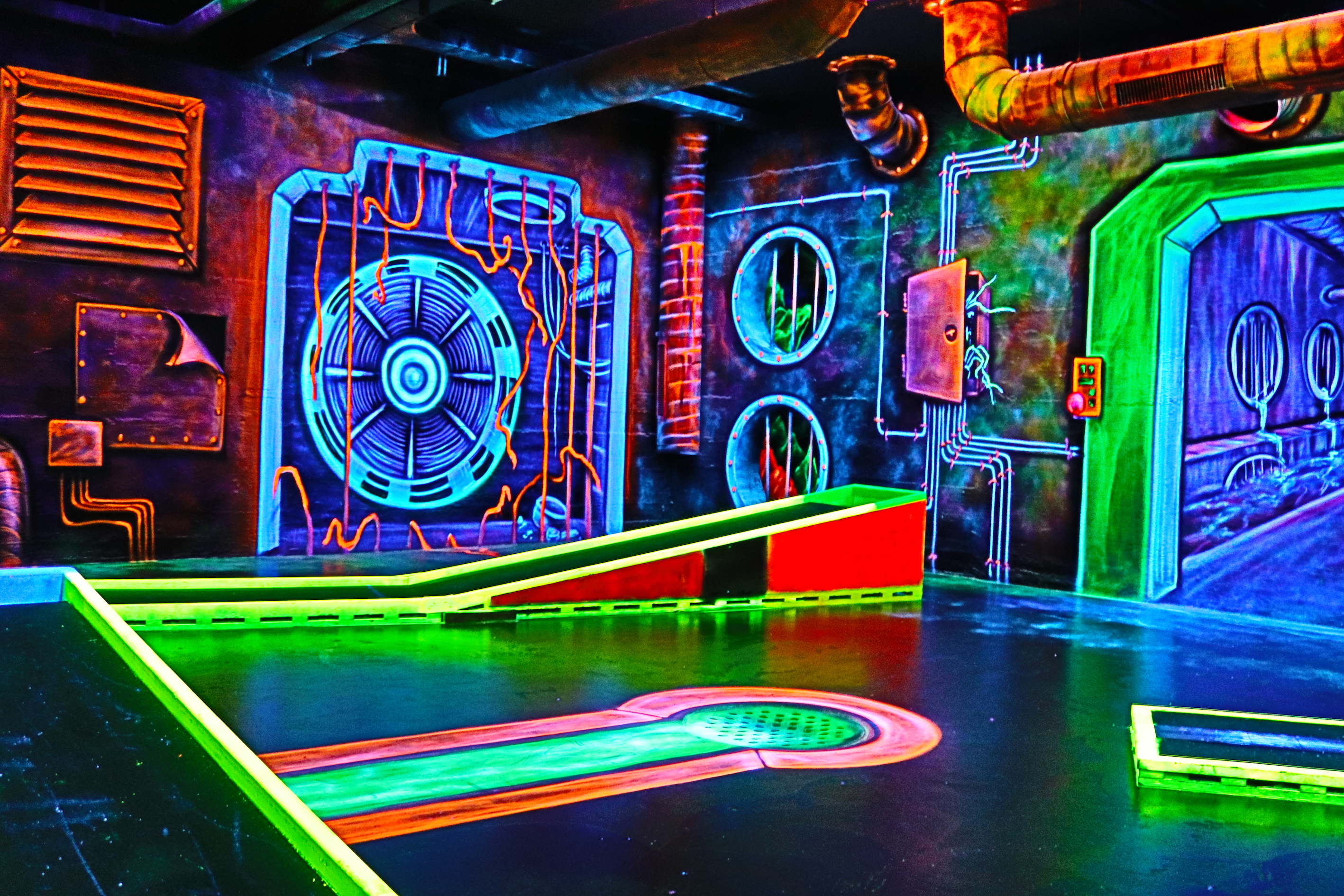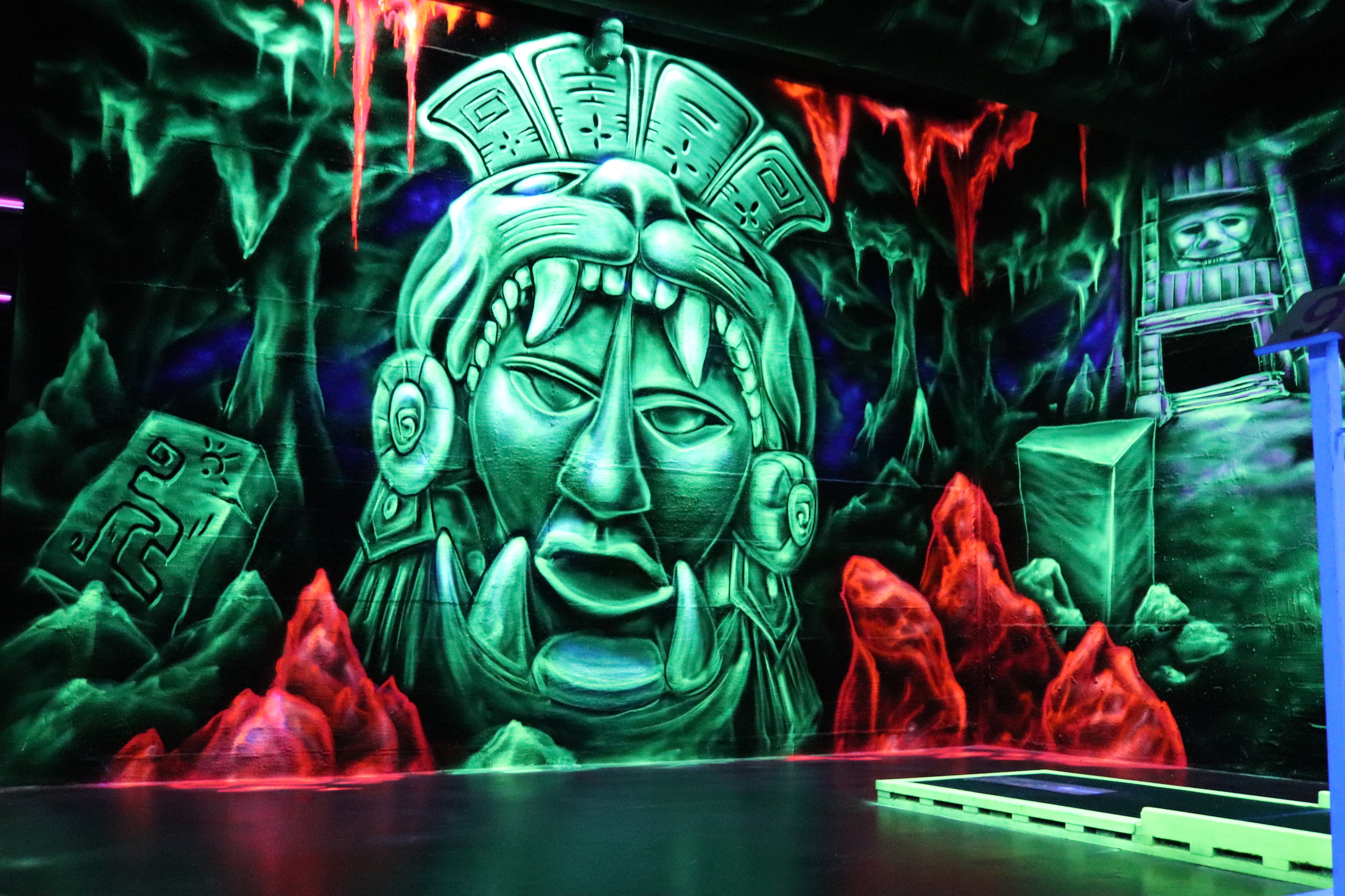Hier im Fantasy Golf mit 3-D-Schwarzlicht erwartet Euch ein neuer Freizeitspaß in ungewöhnlich-fantastischem Ambiente! Wetterunabhängig taucht Ihr ein in eine berauschende Farbenwelt und unternehmt eine aussergewöhnliche Reise in anderen Sphären. In dieser Umgebung spielt Ihr in einer rund 500 Quadratmeter großen Halle auf 18 Minigolfbahnen. Die Wände sind mit schwarzlicht-aktiven Farben und sagenhaften 3-D Motiven gestaltet worden.